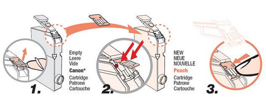 - Sortez la cartouche d'encre Peach de son emballage. Insérez ensuite la puce de la cartouche d’origine dans l’encoche prévue à cet effet.